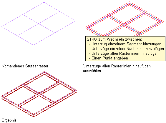| Hinzufügen eines Unterzugs entlang einem oder mehreren Segmenten eines Stützenrasters | Zeigen Sie mit dem Cursor auf ein Segment im Raster, um eine Vorschau des Unterzugs anzuzeigen, und klicken Sie, um den Unterzug zum Segment hinzuzufügen, oder drücken Sie die STRG-Taste, und klicken Sie, um Unterzüge entlang allen Segmenten der Rasterlinie hinzuzufügen, oder drücken Sie zweimal die STRG-Taste, und klicken Sie, um Unterzüge entlang allen Segmenten des Rasters hinzuzufügen. Drücken Sie die EINGABETASTE, um den Befehl zu beenden. |
