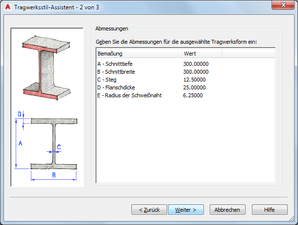 Gehen Sie wie folgt vor, um einen Tragwerksstil über den Tragwerksstil-Assistenten zu erstellen. Sie können innerhalb des Stils eine Tragwerksform erstellen, die auf eine der 19 verschiedenen Formen im Tragwerkskatalog basiert. Die aktuellen Zeichnungseinheiten legen die Einheiten des Stils fest, den Sie erstellen.