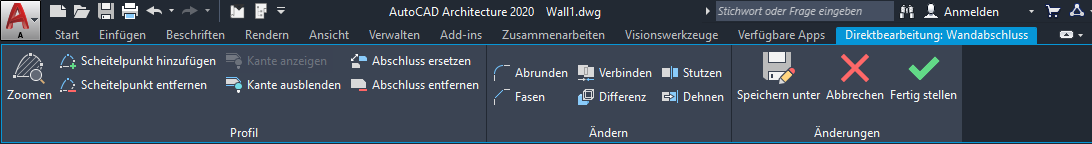 Registerkarte zur Direktbearbeitung von Wandabschlüssen