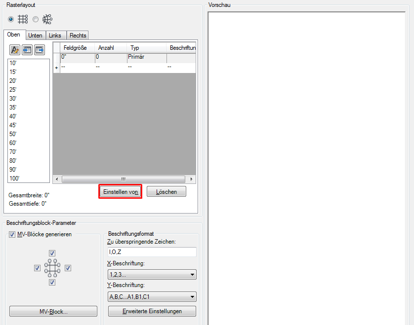 Im Dialogfeld Stützenraster werden die extrahierten Daten des ausgewählten Rasters in der Tabelle Rasterlayout angezeigt. Die Vorschau des ausgewählten Rasters wird ebenfalls generiert und angezeigt.