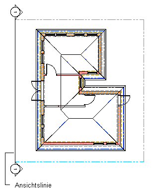 Die Ansichtslinie definiert die Grenzen der Ansicht eines Gebäudemodells. Ansichtslinien können gerade sein oder auch gebrochen verlaufen. Sie können beim Erstellen von Ansichtslinien sowohl die Länge als auch die Höhe des Bereichs angeben, der durch die Ansichtslinie definiert werden soll. An beiden Enden einer Ansichtslinie werden entsprechende Markierungen (Ansichtssymbole) eingefügt, die normalerweise einen Buchstaben oder eine Zahl enthalten und die Richtung der Ansicht angeben.