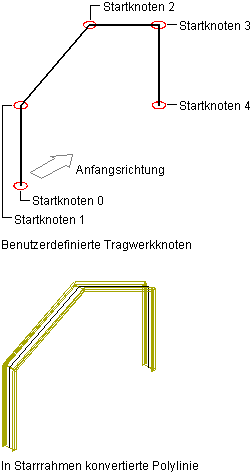 Bei Tragwerken mit mehreren Segmenten können Sie jedem Segment, entsprechend einer Komponente, unterschiedliche Formen zuweisen. Eine Reihe von Knoten (beginnend mit 0 am Anfangspunkt des Tragwerks) entspricht den einzelnen Scheitelpunkten der Tragwerklinie. Indem Sie den Segmenten zwischen den Knoten auf der Tragwerklinie unterschiedliche Formen zuweisen, können Sie ein Tragwerk erstellen, das entlang der Linie von einer Form in andere Formen übergeht. Auf diese Weise können Sie z. B. einen starren Rahmen erzeugen.