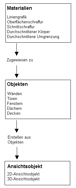 Beim Erstellen eines 2D- bzw. 3D-Ansichtsobjekts aus Gebäudeobjekten werden die Materialzuweisungen der Quellobjekte auf dieses Ansichtsobjekt angewendet. Dabei werden die Materialien nicht unmittelbar der 2D- bzw. 3D-Ansicht zugewiesen. Die Ansicht entnimmt die Materialzuweisungen vielmehr den von ihr erfassten Objekten. Wenn Sie also beispielsweise eine Ansicht einer Wand mit einem Fenster erstellen, werden in dieser Ansicht die Oberflächenschraffuren verwendet, die Sie für das Glas und das Holz des Fensters sowie die Steine dieser Wand definiert haben.
