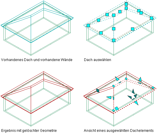 Gehen Sie wie folgt vor, um die Flächen eines existierenden Dachobjekts in einzelne Dachelemente umzuwandeln, die über die Eigenschaften des verwendeten Dachelementwerkzeugs verfügen. Die Dachelemente und ihre Kanten können anschließend einzeln bearbeitet werden.
