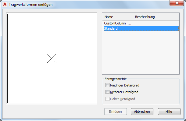 Gehen Sie wie folgt vor, um eine oder mehrere Geometrien in eine Zeichnung einzufügen, die für eine benutzerdefinierte Form definiert wurden. Die Geometrie kann dann bearbeitet oder wie erstellt in einer der Darstellungen für andere benutzerdefinierte Tragwerksformen, die Sie erstellen oder bearbeiten, verwendet werden.