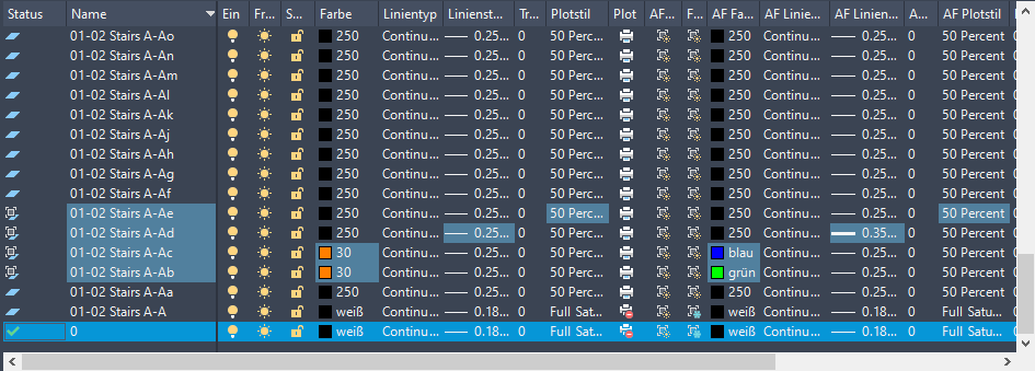 Ein Layer-Wert, der im Ansichtsfenster überschrieben wird, wird durch eine andere Hintergrundfarbe (Standard: hellblau) für die Überschreibungseigenschaft, die globale Eigenschaft und den Layer-Namen hervorgehoben.
