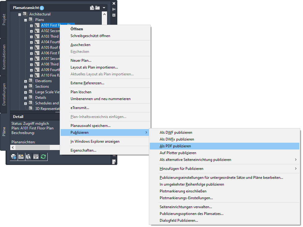 In der Plansatzansicht können Sie Pläne auf einem Plotter, in eine PDF-, eine DWF- oder DWFx-Datei ausgeben. Sie können den Plansatz mit Plotmarkierungen versehen, Pläne mit einer alternativen Seiteneinrichtung publizieren und Einstellungen zum Publizieren im PDF-, DWF- und DWFx-Format festlegen.