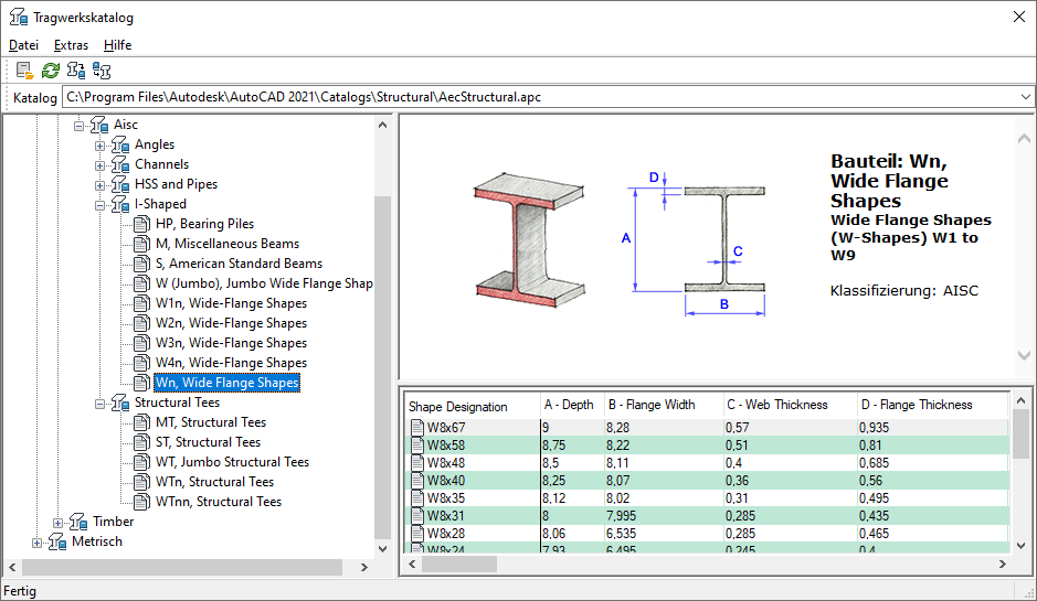 Um Stile für die meisten der vorgegebenen Unterzüge, Träger und Stützen zu erstellen, können Sie den Tragwerkskatalog verwenden, der im AutoCAD Architecture 2026-Toolset integriert ist. Der Katalog enthält industrieübliche Angaben für Beton-, Stahl- und Holz-Tragwerksformen, die in einer Datei-Explorer-ähnlichen Baumstruktur geordnet sind. Sie können den Katalog durchsuchen, eine Form wählen und einen Stil erstellen.