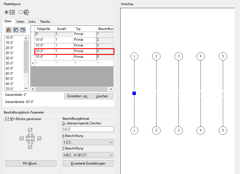 Nun überspannt das erste Feld unten zwei Felder, und Sie haben statt fünf Rasterlinien nur vier. Sie können nun entweder zur Registerkarte Links wechseln, um die Rasterachse zu bearbeiten, oder Sie drücken die EINGABETASTE, um das Raster in der Zeichnung zu platzieren.