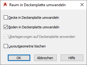 - Wählen Sie einen oder mehrere Räume aus, und drücken Sie die EINGABETASTE, um das Arbeitsblatt Raum in Deckenplatte umwandeln zu öffnen.