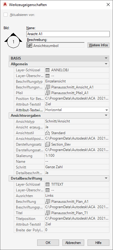 Pfeil | Schnitt/Ansicht | Legen Sie hier den Block für den Schnittlinien- bzw. Ansichtssymbolpfeil fest. |