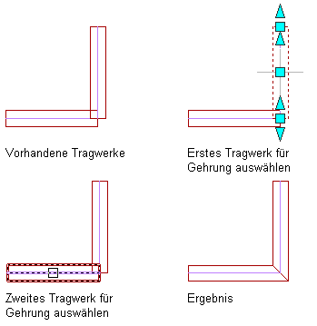 Erstellen einer Gehrungsverbindung zwischen zwei Tragwerken mit zusammenfallenden Endpunkten