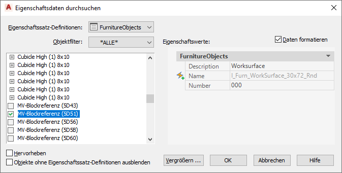 Anzeigen der Liste von Objekten oder Stilen, denen ein Eigenschaftssatz zugeordnet ist | Wenden Sie den Objektfilter auf den Eigenschaftssatz an. Im linken Fensterbereich werden Objekte oder Stile aufgeführt, denen der Eigenschaftssatz hinzugefügt wurde. Wenn die Option Hervorheben aktiviert ist, werden alle Objekte, denen der Eigenschaftssatz (direkt oder über einen Stil) zugeordnet ist, in der Zeichnung hervorgehoben. |