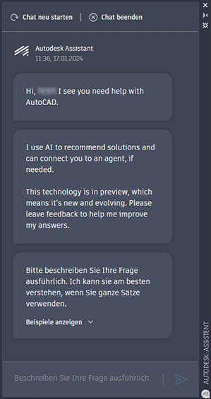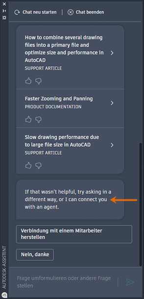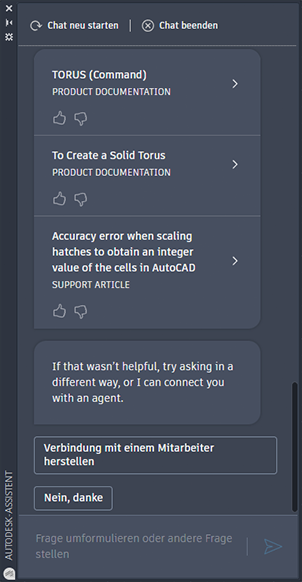Zeigt die Palette Autodesk-Assistent an, in der Sie nach Hilfe aus verschiedenen Quellen suchen, den Support kontaktieren oder Feedback geben können. Die Suchergebnisse werden durch Autodesk AI unterstützt.