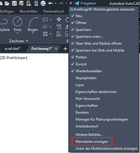 1. Um das Menü anzuzeigen, klicken Sie auf Dropdown-Menü Schnellzugriffs-Werkzeugkasten > Menüleiste anzeigen.