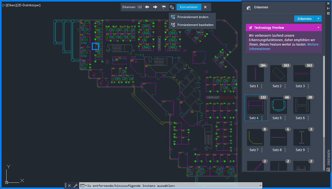 Die Funktion Erkennen und konvertieren von AutoCAD verwendet Autodesk AI, um Ihre Zeichnung zu scannen und Objekte zu ermitteln, die in Blöcke konvertiert werden können.