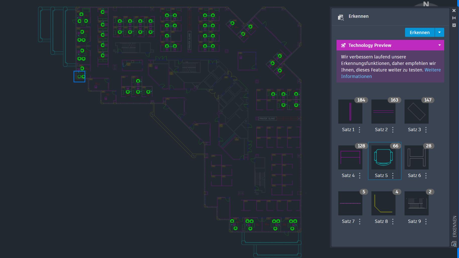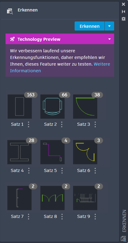 Wenn Sie Erkennen starten, scannt Autodesk AI die Geometrie der Zeichnung. Sobald die Zeichnungsanalyse abgeschlossen ist, werden Sie von der Palette über Sätze von erkannten Objekten informiert, die in Blöcke konvertiert werden können. Ein Satz stellt eine Gruppe ähnlicher erkannter Objekte dar, die in Instanzen eines einzelnen Blocks konvertiert werden können.