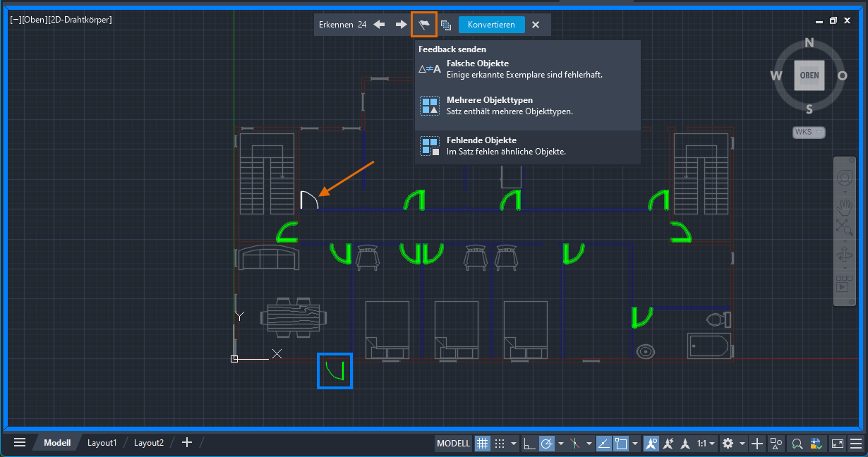 - Erkennen und konvertieren ist für Draufsichtzeichnungen konzipiert. Derzeit eignet sich die Erkennung am besten zur Identifizierung architektonischer Objekte wie Türen, Badewannen und Toiletten, obwohl möglicherweise in dieser Version nicht alle architektonischen Objekte korrekt erkannt werden.