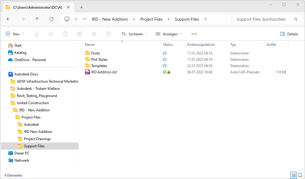 Die den lokalen Ordnern hinzugefügten Support-Dateien werden mithilfe von Desktop Connector mit Autodesk Docs synchronisiert.