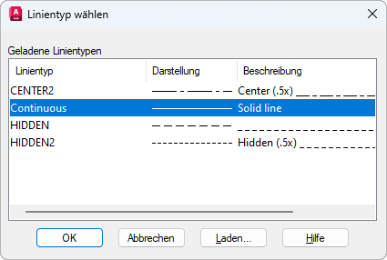 Zeigt die Liste der Linientypen an, die in der aktuellen Zeichnung geladen sind.