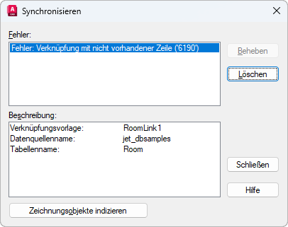 Das Dialogfeld Synchronisieren enthält eine Liste der festgestellten Fehler. Bestimmte Fehler (beispielsweise die Änderung der Größe einer Spalte in der Quelldatenbanktabelle) können direkt über das Dialogfeld Synchronisieren behoben werden. Andere Fehler, wie zum Beispiel Verknüpfungen, die auf nicht vorhandene Datensätze verweisen, müssen in der Quelldatenbanktabelle korrigiert werden.