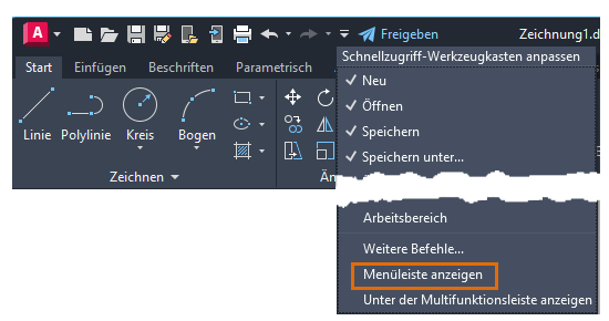 Die Menüleiste kann über die Dropdown-Liste des Schnellzugriffs-Werkzeugkastens oder durch Anpassen der Benutzeroberfläche mit dem Befehl ABI aktiviert werden.