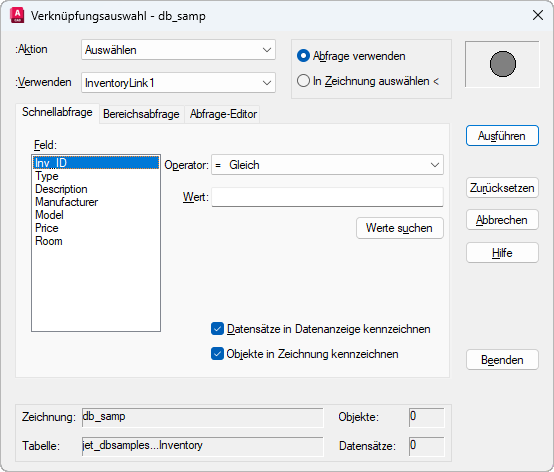Führt die aktuelle Abfrage aus der Verknüpfungsauswahl aus oder schließt das Dialogfeld Verknüpfungsauswahl vorübergehend, sodass Sie grafische Objekte aus der Zeichnung auswählen können. Wenn die Option Abfrage verwenden aktiviert ist, wird die Schaltfläche Ausführen angezeigt. Wenn die Option In Zeichnung auswählen ausgewählt wurde, wird die Schaltfläche Auswählen angezeigt. Nach Auswahl der Schaltfläche Ausführen oder Auswählen können Sie weitere Abfragen anwenden oder zusätzliche grafische Objekte in den Auswahlsatz aufnehmen.