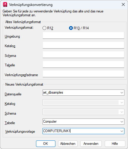 Format der zu konvertierenden Verknüpfung. Für R12 und R13/R14 werden verschiedene Felder angezeigt.