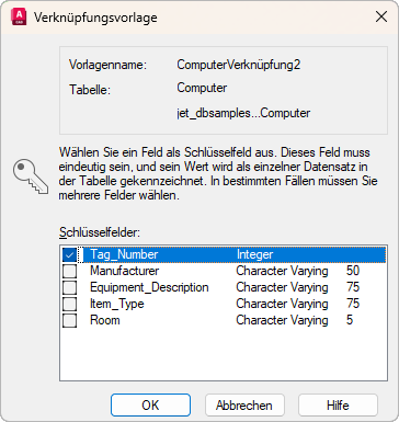 Zeigt alle Felder an, die für die aktuelle Datenbanktabelle zur Verfügung stehen, außerdem den Feldtyp sowie (bei alphanumerischen Feldern) die Feldlänge. Um ein Schlüsselfeld für die Verknüpfungsvorlage festzulegen, aktivieren Sie das Kontrollkästchen links neben dem gewünschten Feldnamen.