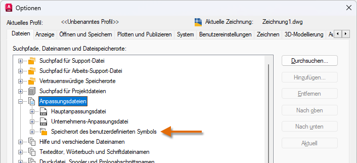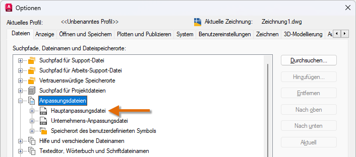 Benutzerprofile sind benannte Sammlungen von Einstellungen für die Anwendung und die Zeichnungsumgebung. Zu diesen Einstellungen gehören die Farbe des Zeichnungsfensters, die Cursorgröße, die Schriftart im Befehlszeilenfenster, das Wörterbuch für die Rechtschreibung usw.