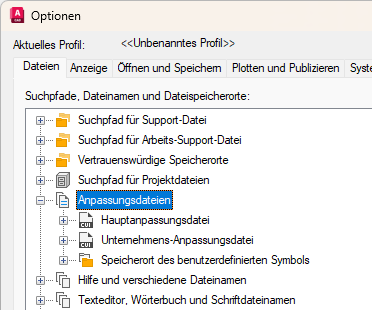 - Klicken Sie im Dialogfeld Optionen auf der Registerkarte Dateien auf das Pluszeichen (+) neben Anpassungsdateien, um den Knoten zu erweitern.