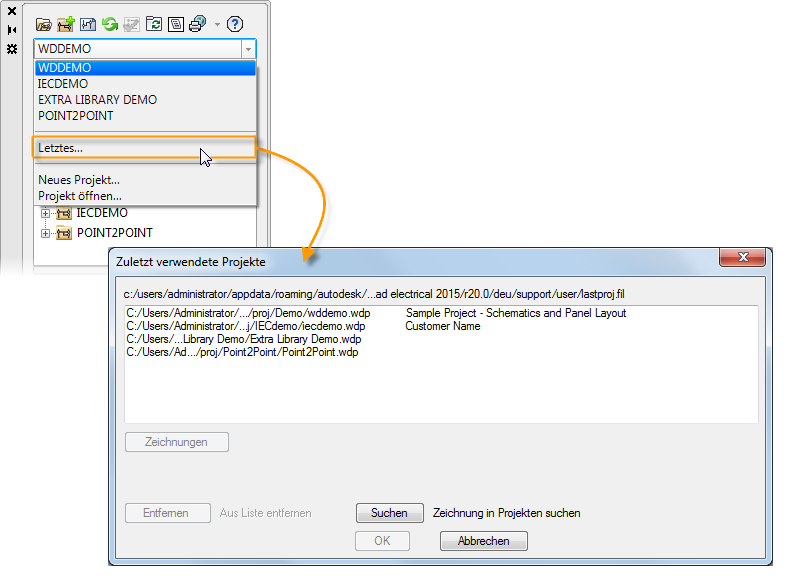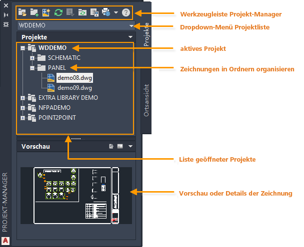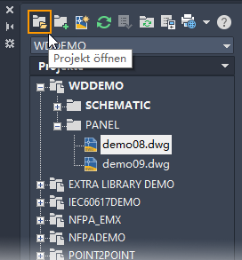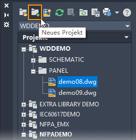 AutoCAD Electrical-Toolset ist projektbasiert. Ein Projekt besteht aus einem Satz zusammenhängender Zeichnungen. Alle projektbezogenen Informationen, einschließlich der im Projekt enthaltenen Zeichnungen, werden in einer Projektdatei mit der Erweiterung WDP gespeichert.