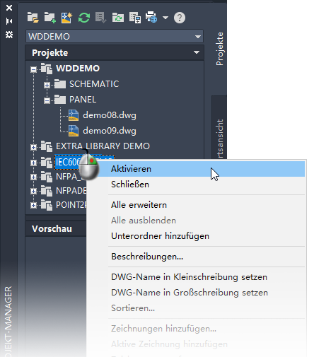 Sie können im Projekt-Manager beliebig viele Projekte geöffnet haben, es kann jedoch jeweils nur ein Projekt aktiv sein. Durch projektweite Funktionen werden nur die Zeichnungen des aktiven Projekts verarbeitet.