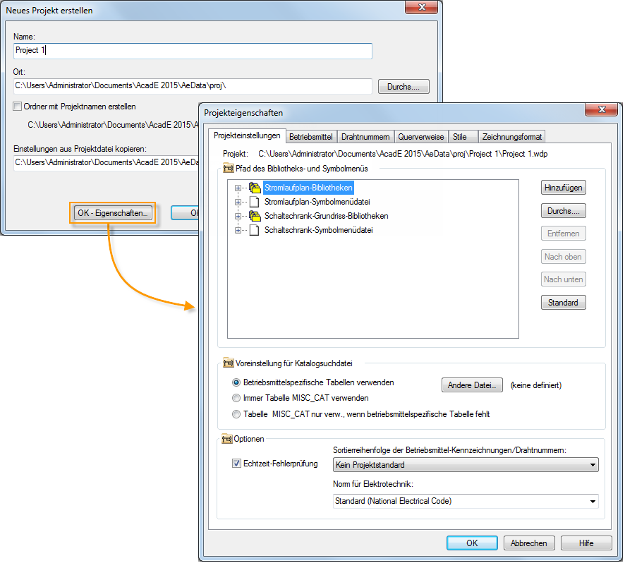 Sie können die Projekteigenschaften wie Bibliothekspfade, Zeichnungsformat und Querverweisstil beim Starten eines neuen Projekts oder zu einem beliebigen späteren Zeitpunkt definieren.