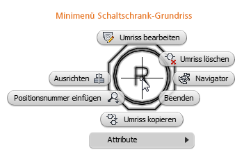 Vergewissern Sie sich, dass der aktuelle Arbeitsbereich auf AcadE 2D-Zeichnung und Beschriftung gesetzt ist. Das Minimenü ist ein kreisförmig angeordnetes Kontextmenü. Verschieben Sie den Cursor auf ein Electrical-Objekt, und klicken Sie mit der rechten Maustaste. Die Optionen des daraufhin angezeigten Kontextmenüs sind abhängig von der Art des mit dem Cursor ausgewählten Objekts.