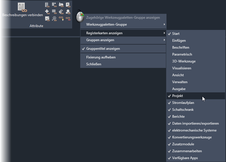 Klicken Sie mit der rechten Maustaste auf den Bereich mit den Registerkarten, und wählen Sie aus, welche Registerkarten angezeigt bzw. ausgeblendet werden sollen.