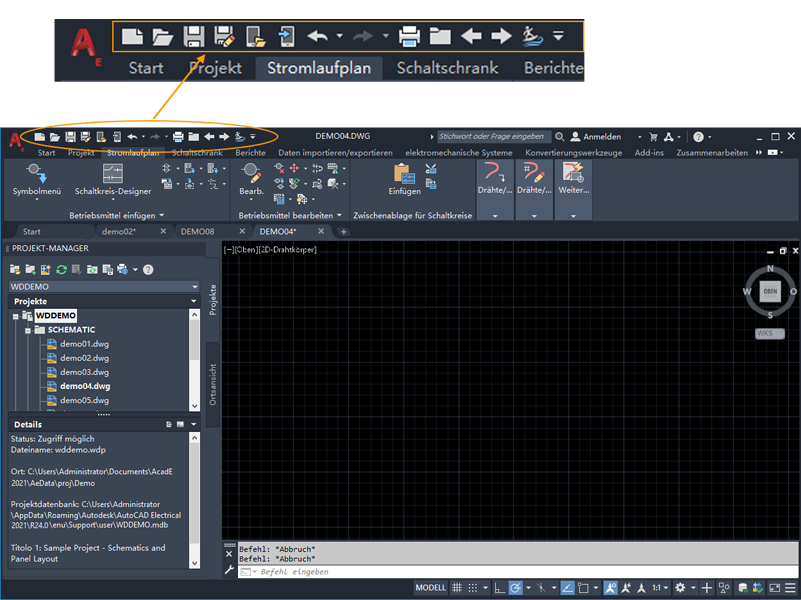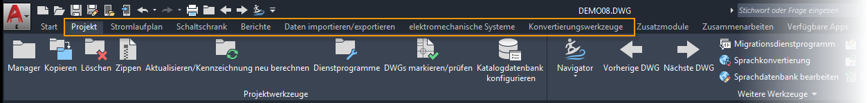 Über die Multifunktionsleiste haben Sie Zugriff auf alle in diesem Handbuch beschriebenen Funktionen. Darüber hinaus enthält der abgebildete Schnellzugriff-Werkzeugkasten spezifische Navigationsbefehle für AutoCAD Electrical-Toolset.