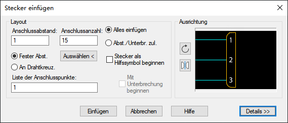 Mit dem Werkzeug Stecker einfügen wird ein Steckersymbol aus benutzerdefinierten Parametern erzeugt. Das Symbol wird unmittelbar erstellt und als eine Blockeinfügung in die aktive Zeichnungsdatei eingefügt. Da die Erstellung nach Bedarf erfolgt, müssen Sie keine Bibliothek mit Steckersymbolen erstellen oder pflegen.