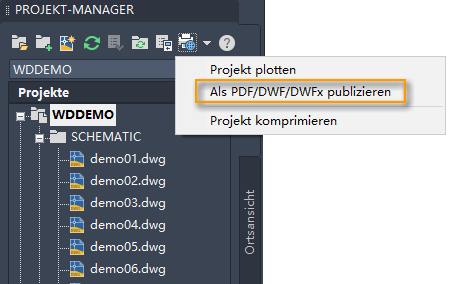 Zum Drucken Ihres Projekts verwenden Sie die Schaltfläche Publizieren/Plotten im Projekt-Manager.