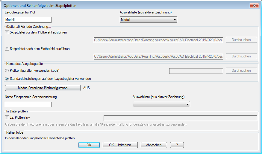 Wählen Sie unbedingt aus, welches Layout für die ausgewählten Zeichnungen geplottet werden soll. Wenn Sie eine Seiteneinrichtung definiert haben, geben Sie deren Namen ein.
