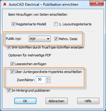 In Projekten von AutoCAD Electrical-Toolset bestehen Beziehungen zwischen Betriebsmitteln, z. B. zwischen einem übergeordneten und einem untergeordneten Betriebsmittel oder zwischen einem Stromlaufplan und einem Schaltschrank. Sie können Ihr Projekt in eine PDF-Datei ausgeben, die Hyperlinks zwischen zugehörigen Betriebsmitteln enthält.