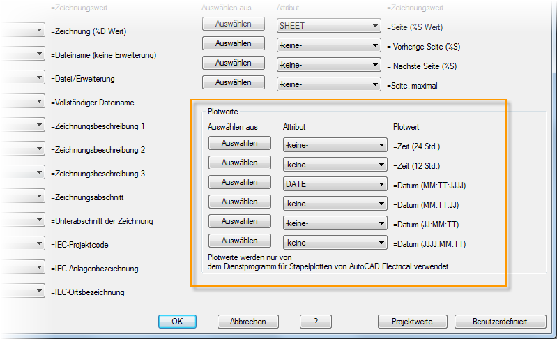 Als Teil der Schriftfeldeinrichtung können Sie einem bestimmten Attribut ein Format für das Plotdatum und die Uhrzeit zuordnen. Dieses Attribut wird automatisch aktualisiert, wenn Sie die Zeichnung plotten.