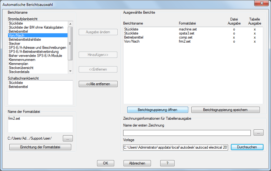 Mit der Option Automatische Berichte können Sie eine Gruppe von Berichten und eine Formatdatei für jeden Bericht auswählen. Die Berichte werden nicht auf dem Bildschirm angezeigt. Jede Formatdatei muss den Bericht entweder in eine Datei ausgeben, in eine Tabelle einfügen oder beides. Für neue Tabellen werden neue Zeichnungen zum Projekt hinzugefügt.