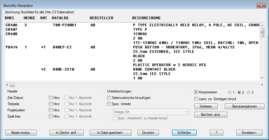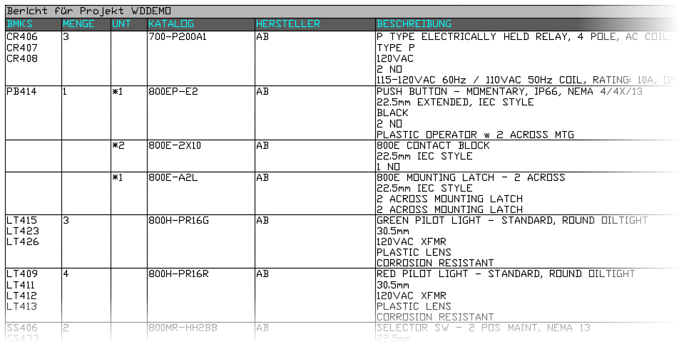 In AutoCAD Electrical-Toolset steht eine Reihe von Berichten zur Auswahl. Einige Berichte enthalten Informationen, die ausschließlich aus Ihren Stromlaufplanzeichnungen extrahiert wurden, während andere Berichte nur Informationen aus Schaltschrankaufbau-Zeichnungen enthalten. Sie können auch einen vollständigen Stücklistenbericht mit allen Schaltschrank-Betriebsmitteln sowie allen nicht in den Schaltschrank-Aufbauten enthaltenen Stromlaufplanbetriebsmitteln erstellen.