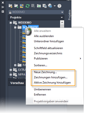 Fügen Sie dem aktiven Projekt jederzeit vorhandene Zeichnungen hinzu. Dies machen Sie zum Beispiel, wenn Sie Zeichnungen eines früheren Projekts wiederverwenden möchten. Zum Hinzufügen oder Erstellen von Zeichnungen in einem bestimmten Ordner klicken Sie mit der rechten Maustaste auf den Ordnernamen im Projekt-Manager und wählen die Zeichnungsoption aus.
