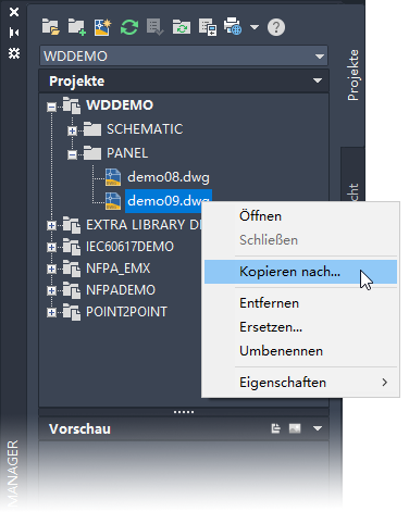 Verwenden Sie den Projekt-Manager, um eine einzelne Zeichnung aus einem beliebigen geöffneten Projekt zu kopieren und zum aktiven Projekt hinzuzufügen.