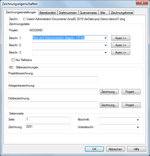 Die Zeichnungseigenschaften können auch später noch geändert werden. Sie müssen in diesem Fall aber vermutlich mehrere Befehle ausführen, um die Betriebsmittel, Drahtnummern usw. zu aktualisieren. Es empfiehlt sich also, die Zeichnungseigenschaften vor dem Einfügen von Stromlaufplänen, Betriebsmitteln, Modulen und Drähten festzulegen.