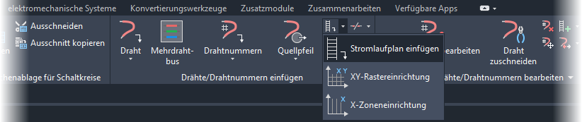 Wenn das Format des Referenzsystems definiert ist, können Sie den Stromlaufplan, das XY-Raster oder die X-Zone in eine Zeichnung einfügen. Die hierfür erforderlichen Befehle befinden sich auf der Registerkarte Stromlaufplan