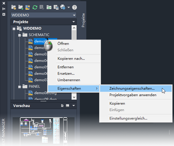 Die Zeichnungseigenschaften können aus den für das Projekt festgelegten Zeichnungsvorgaben übernommen werden. Mit dem erst später beschriebenen Befehl Projektweite Neuanordnung/Neuberechnung sind Aufgaben wie die Aktualisierung von Stromlaufplänen, die Neuberechnung von Betriebsmittel-Kennzeichnungen und Drahtnummern oder die Aktualisierung von Querverweisen sehr schnell durchgeführt.