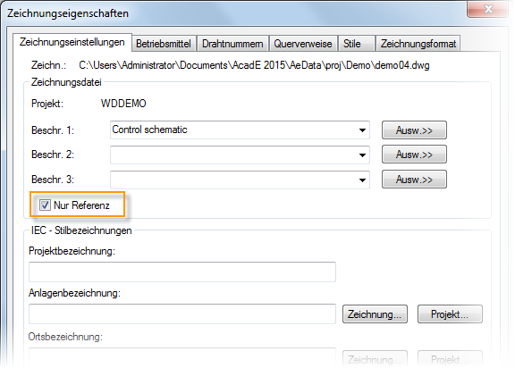 Eventuell enthält Ihr Projekt Zeichnungen, die aus projektweiten Funktionen ausgeschlossen sein sollen. Vielleicht handelt es sich nicht einmal um Elektrozeichnungen, sondern um Zeichnungen, die für das Gesamtdesign erforderlich sind. Für solche Zeichnungen können Sie in den Zeichnungseigenschaften festlegen, dass es sich nur um Referenzen handelt.